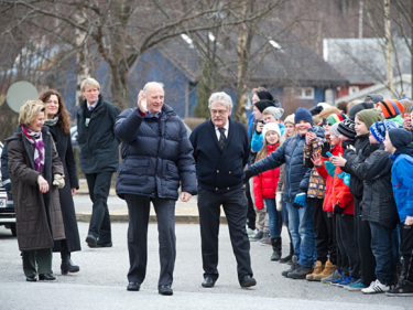 Etter orienteringa reiste Kongen og Dronninga vidare til Lærdalsøyri skule for eit møte med lærarar og elevar. Rektor Ivar Fykse følgde Kongeparet til klasse 8b, der Kong Harald og Dronning Sonja fekk snakke med elevane om opplevingane og minna frå brann-natta.