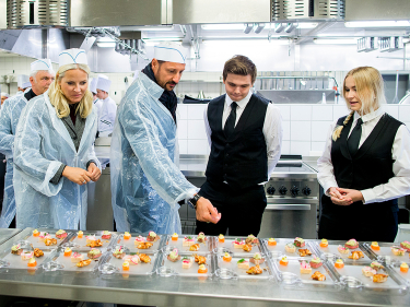 «På en så ny skole har man selvsagt en egen skolerestaurant for kokkeelevene. Og allmennfagelever sier det er dritbra.» Kronprinsen og jeg er helt enige. Dette er virkelig en fantastisk skole dere har, med et rikt tilbud til elevene. Jeg forstår godt at andelen som gjennomfører utdanningen sin her er langt over gjennomsnittet.