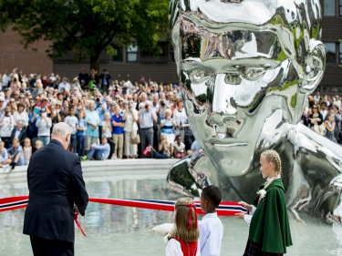 Skulpturen foran oss, som snart skal avdukes, har allerede høstet internasjonal oppmerksomhet. Kunstneren, Finn Eirik Modahl, har gitt kunstverket navnet «Genesis». I skulpturen fremstilles en ung Olav – i skikkelsen til et nåtidig ungt menneske med stort potensial og ambisiøse mål for fremtiden. Det passer jo riktig bra – kanskje særlig når man har nådd en anselig alder, slik tilfellet er med Sarpsborg.