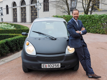 Her er et bilde av norsk bilindustri. En liten bit av den i hvert fall. Dette er altså en Think. Og den bilen fikk jeg tak i i 2003 - da var den brukt og hadde gått en stund. Det var en elbil og Norge satset på elbil. Vi fikk lov til å kjøre i taxifeltet sånn at vi kunne komme raskere forbi køen. Det var flere fordeler. Bilen heter jo Think, og du måtte tenke litt for her var ikke rekkevidden særlig lang. Så på begynnelsen kunne jeg kjøre fra Asker der vi bor til kontoret og tilbake igjen, men mot slutten måtte vi lade på hvert sted. Også hadde jeg jo 40-årskrisen i femårsplanen på den tiden, så jeg fikk satt inn en liten boomboks, en basskasse, bak i elbilen, sånn at vi fikk litt mer trykk i anlegget ...