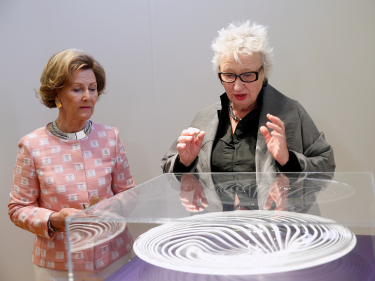 Det funkler mange kjente navn i samlingen – mange av kunstnerne er tilstede her i kveld – men Benny Motzfeldt lyser med egen glans. Fra hun som designer skapte sitt opprinnelig uttrykk på Randsfjord glassverk fra 1967, og gjennom blomstringsårene i verkstedet Plus i Fredrikstad, utforsket hun de tekniske muligheter ved glasskunsten.